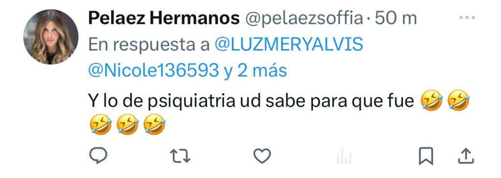 De hecho, a través de una de sus cuentas falsas, afirmó que ya se sabía la razón de su supuesta afectación mental… haciendo alusión a que todo era un montaje para fabricar un caso y destruir a Luis Fernando, como claramente ha sido su intención todo el tiempo. ( prueba n 37).